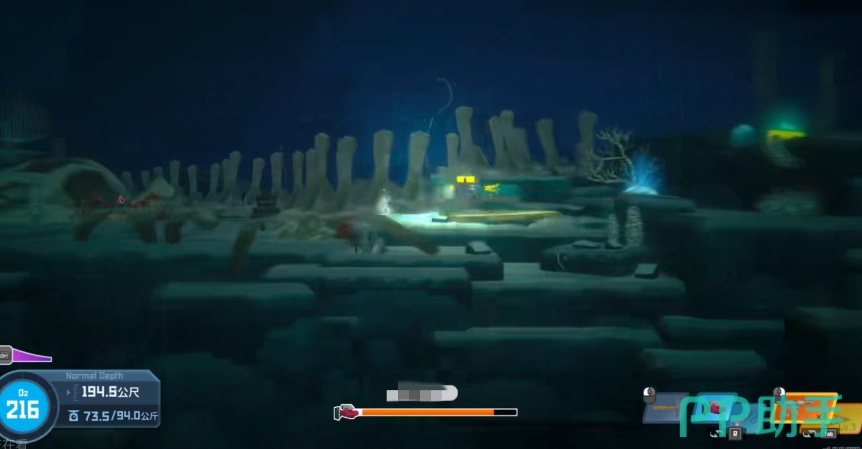 再游到第一个螃蟹这里补充弹药和氧气,继续向右游到头往下走,抓两个自爆水母以后,在底下还有一个弹药箱。获取后直接回到刚才电水母那里收走最后三只。