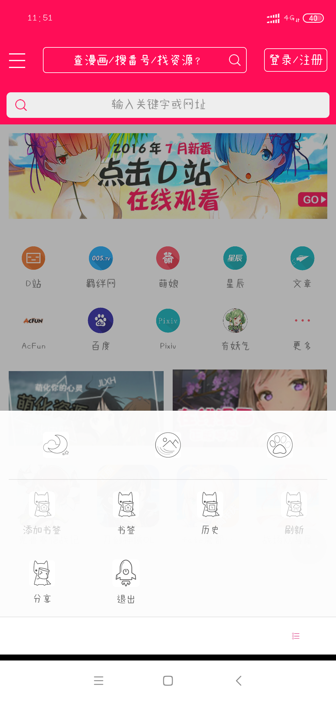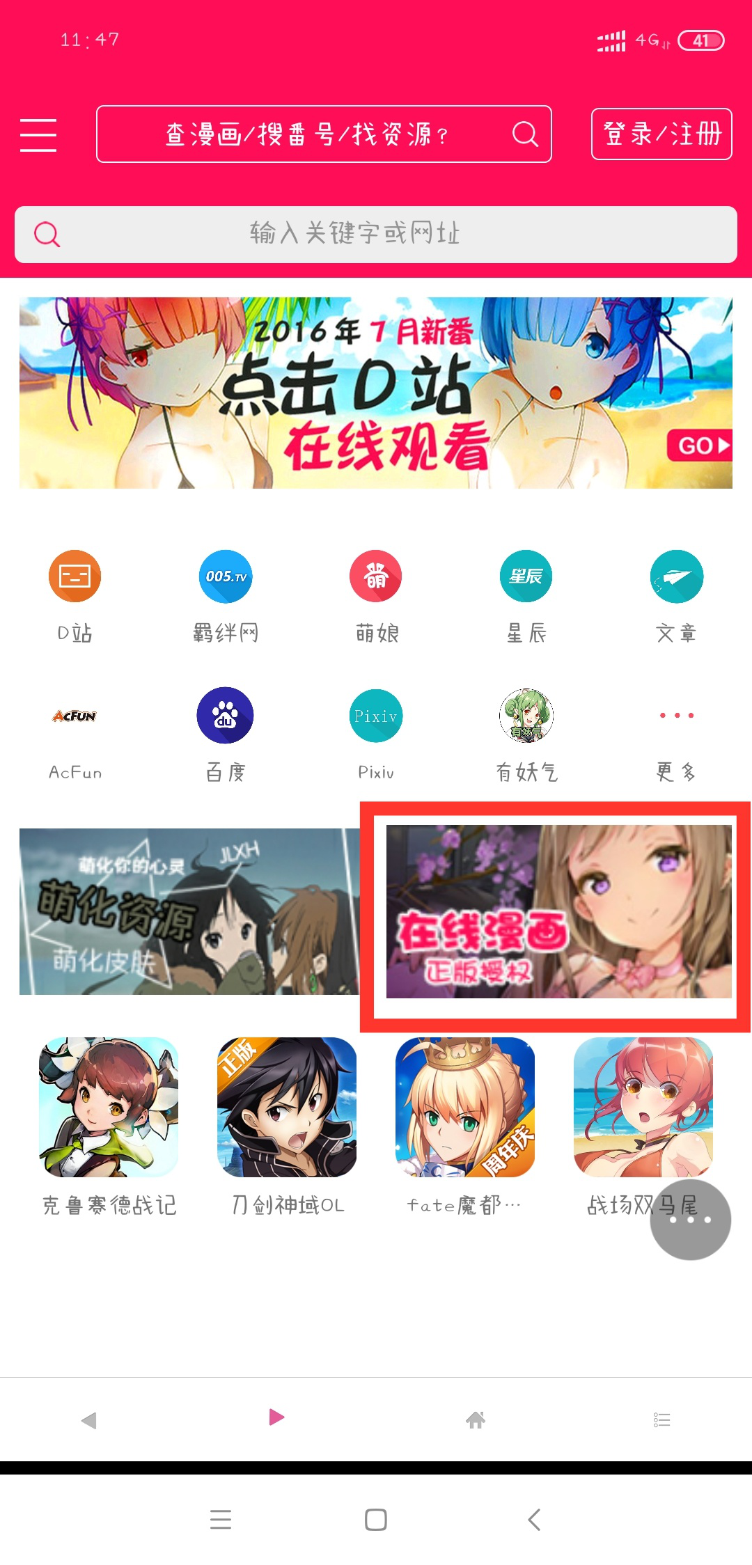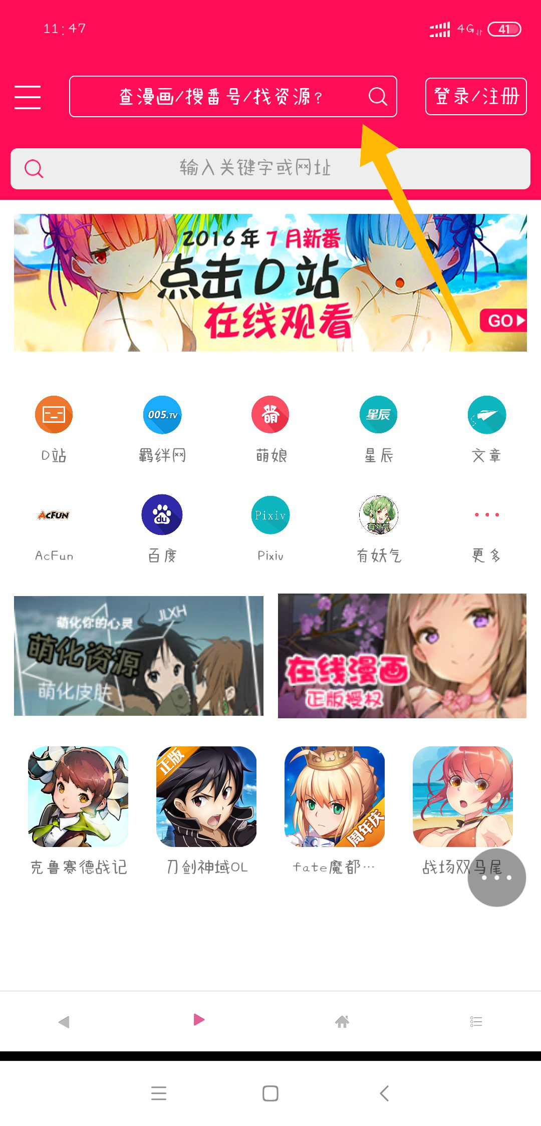 1.打开软件,进入首页。点击右上角注册账号即可登录。点击上方搜索框,输入动漫的名字即可快速搜索资源。