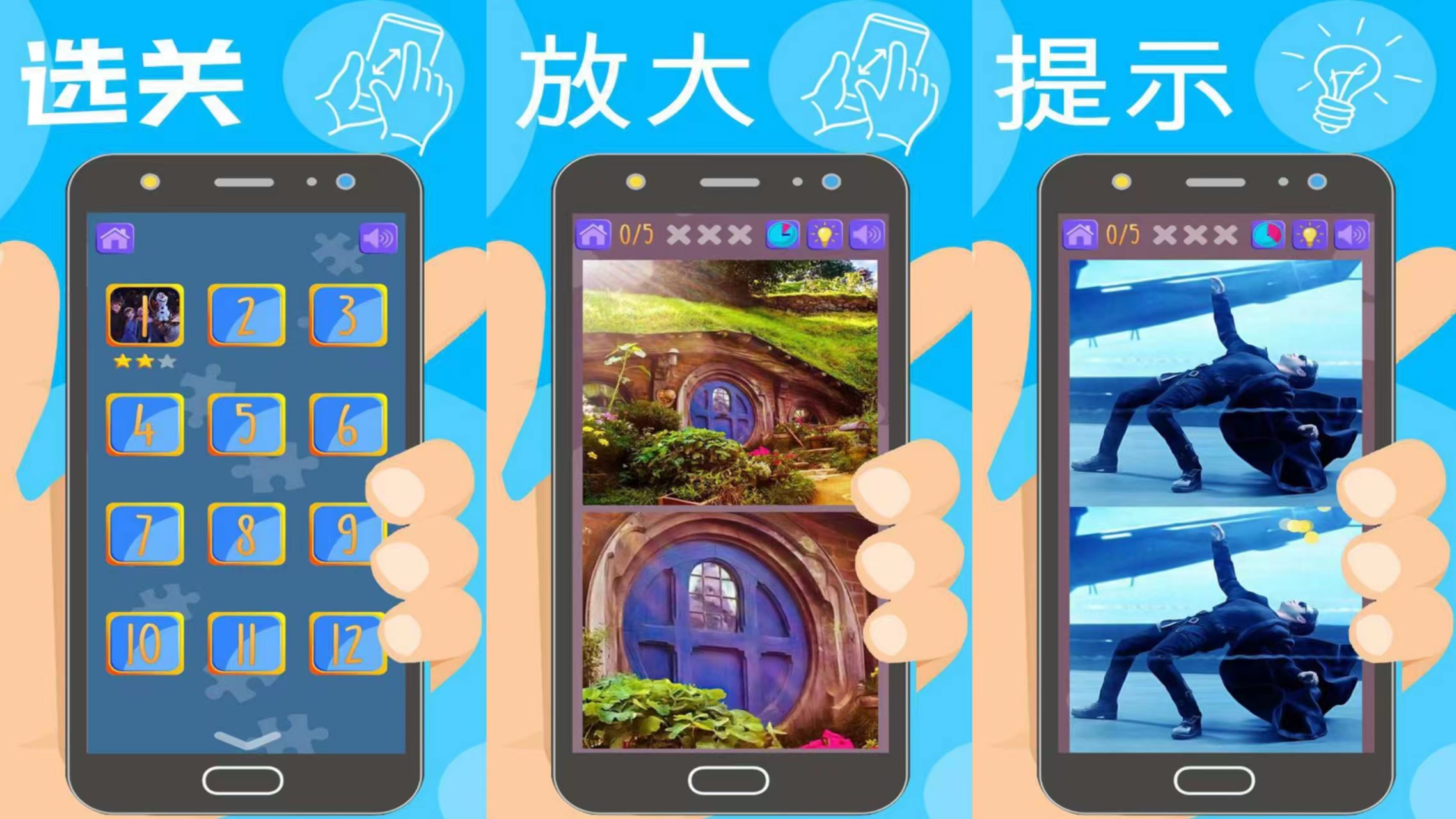 进入游戏能够直观的看到一个类似于手机桌面的画面,在桌面上会放上上下两张图片。玩家在找不同的过程中,可以无限放大每一个图片的细节,鉴于能够对两个图片做更好的对比。有完善的提示功能,在玩家遇到困难的时候可以给出关键信息。玩家还能根据自己的水平选择难度适中的关卡任务,一系列的设计都非常人性化。