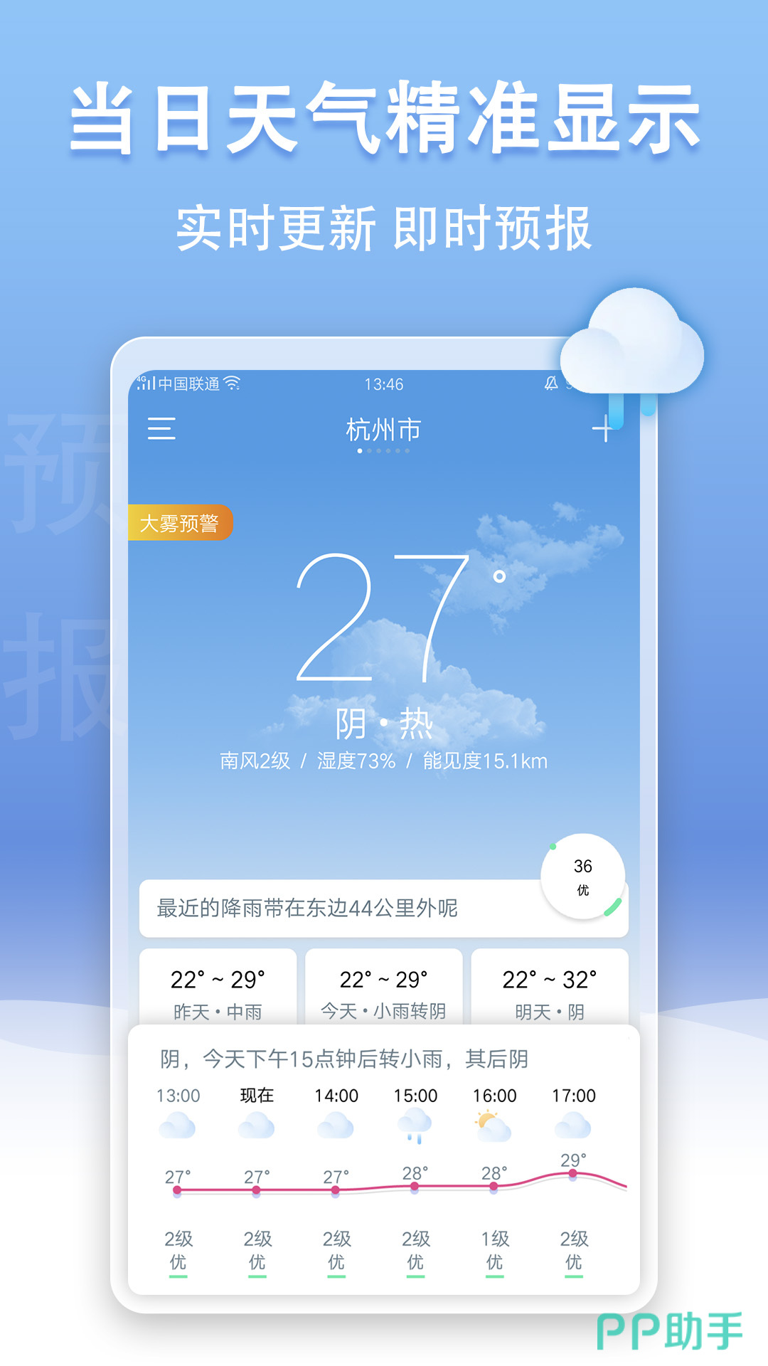 有了这款准确的天气预报的指点,用户就能够根据不同的天气气候来进行衣物的添加天气预报空间,拥有专业的官方数据,提供准确的预报清晰,并且了解到关于天气的细节之后,用户就能够有针对性的带伞带雨衣或者说带外套,了解周围的温度,随时注意防寒保暖,最大程度上的保障个人健康。