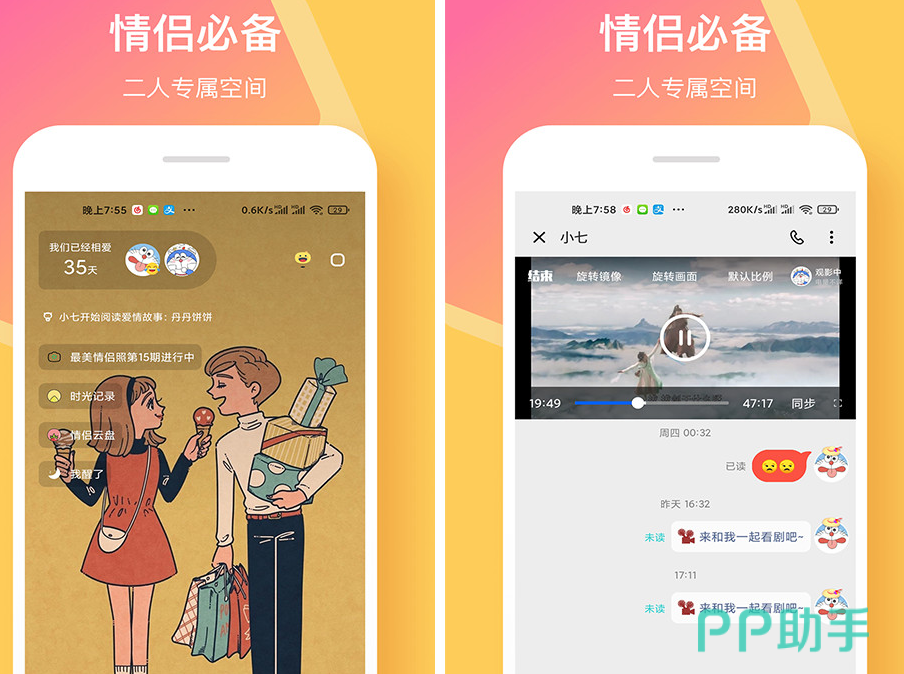 这是一款能够打造专属甜蜜空间的app,软件支持一起看电影,可以同步播放视频并在对话框中聊天,让大家可以与TA实时互动。软件提供了经期日历,女生记录男生呵护,让恋爱多一份温暖。app还提供了冰箱贴留言功能,大家可以把想要完成的心愿写在冰箱贴上,让另一半与你共同实现吧。