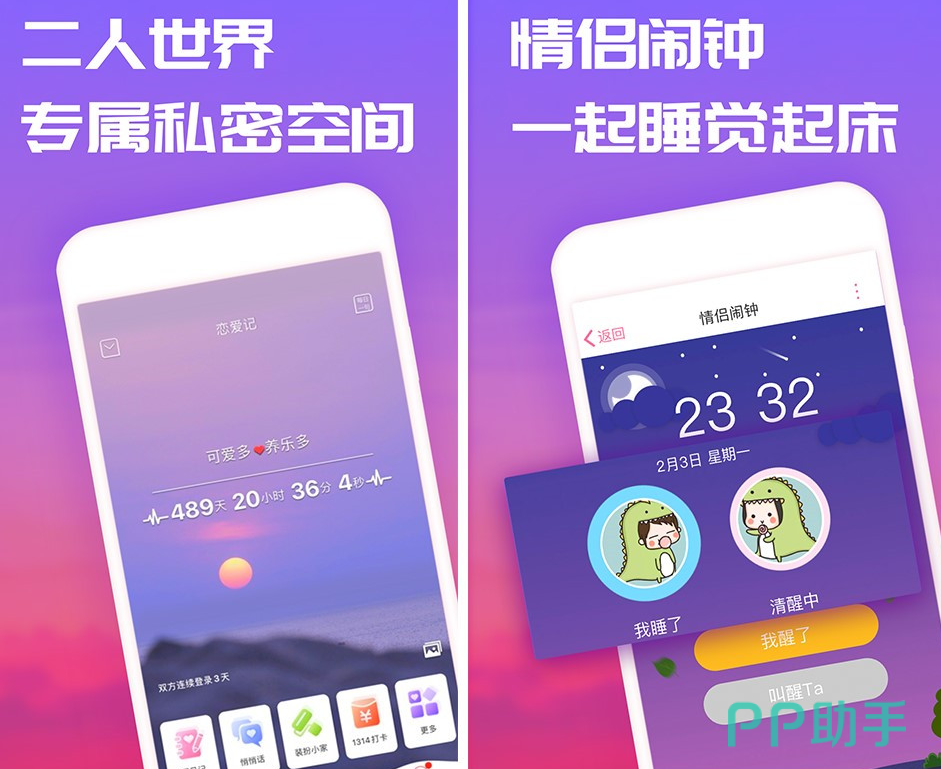 这是一款情侣们专属的app,大家可以在这里私密互动和聊天,用文字和图片记录每天的恋爱小日常。软件非常适合异地恋的情侣们使用,提供了情侣闹钟功能,情侣们可以一起睡觉并叫对方起床。app提供了清单功能,让情侣们一起完成恋爱的100件小事吧。此外,双方连续365天完成我爱你的打卡,就可以体现1314元现金奖励。
