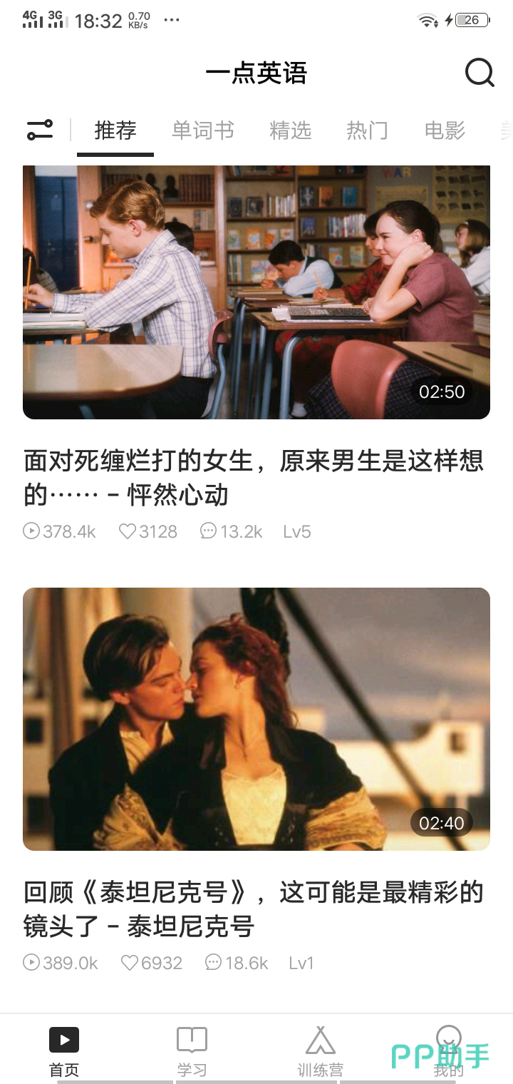 打开一点英语APP首页,在最上方可以看到“推荐”选项,该APP推荐的视频内容包括热门英剧美剧、英语电影节选、英文综艺、演讲脱口秀、动画片、新闻等,点击对应的视频选项即可进入观看。