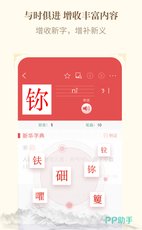 学习汉语必备的一个工具书软件,适合中国本土居民和海外华人学习使用,里面对汉字有大量的英语解释,对懂音乐的外国人士使用起来也会更加的方便,学习一个汉字就能学习到与他相似的汉字,举一反三的效果是对知识和学习更好的迁移。