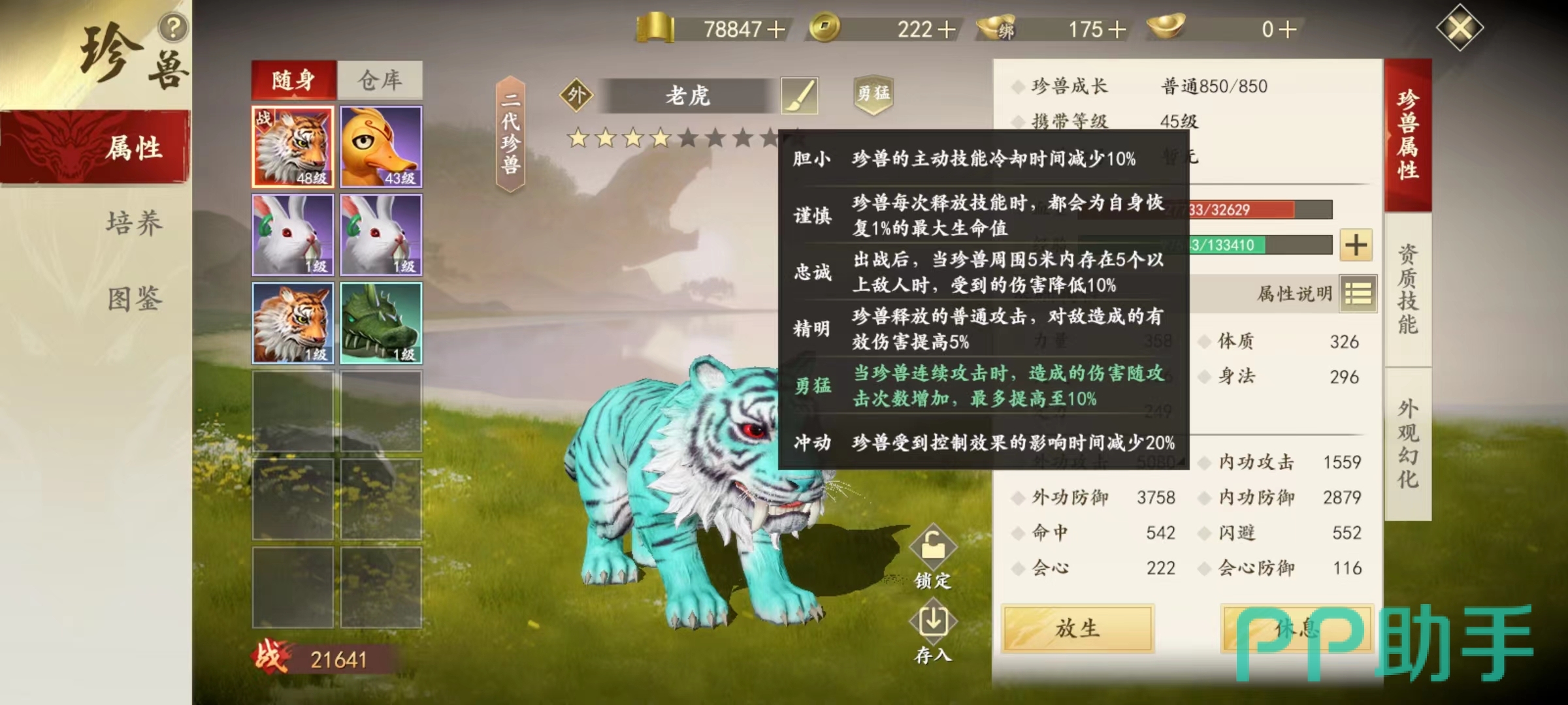 谨慎则是在释放技能时自身获得生命值恢复,为最大血量1%,适合一些高体力资质平衡型宝宝选择,尤其是当做肉盾使用更加合适。忠诚是在出战后,如果自身5米内有5个以上敌人,则受到伤害降低,同样适合肉盾型宝宝选择。精明则是在使用普通攻击时提高有效伤害,数值为5%,无论是内功或是外功都适合选择。勇猛当使用连续攻击时造成伤害将会随着攻击次数增加而提高,最多能提高到10%,外攻型宠物最喜欢的类型。