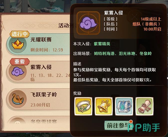 2、选择限时活动,选择【紫雾入侵】副本,选择参与前往。