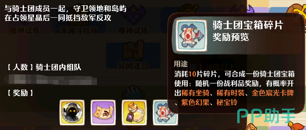 该模式是一个比较艰巨的过程,需要玩家对自己角色,猫灵以及装备的练度都达到一定水准,否则就没法染指那丰厚的奖励了,守卫星晶的奖励包括“度玛”,“资金券”,“混沌之尘”和“骑士团宝箱碎片”这四种,其中度码是最为珍贵的,因为它可以直接给你一颗橙色品质的幻果。
