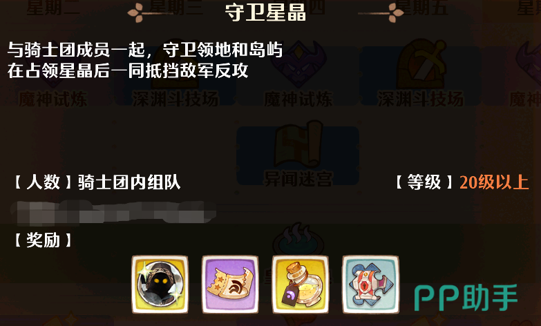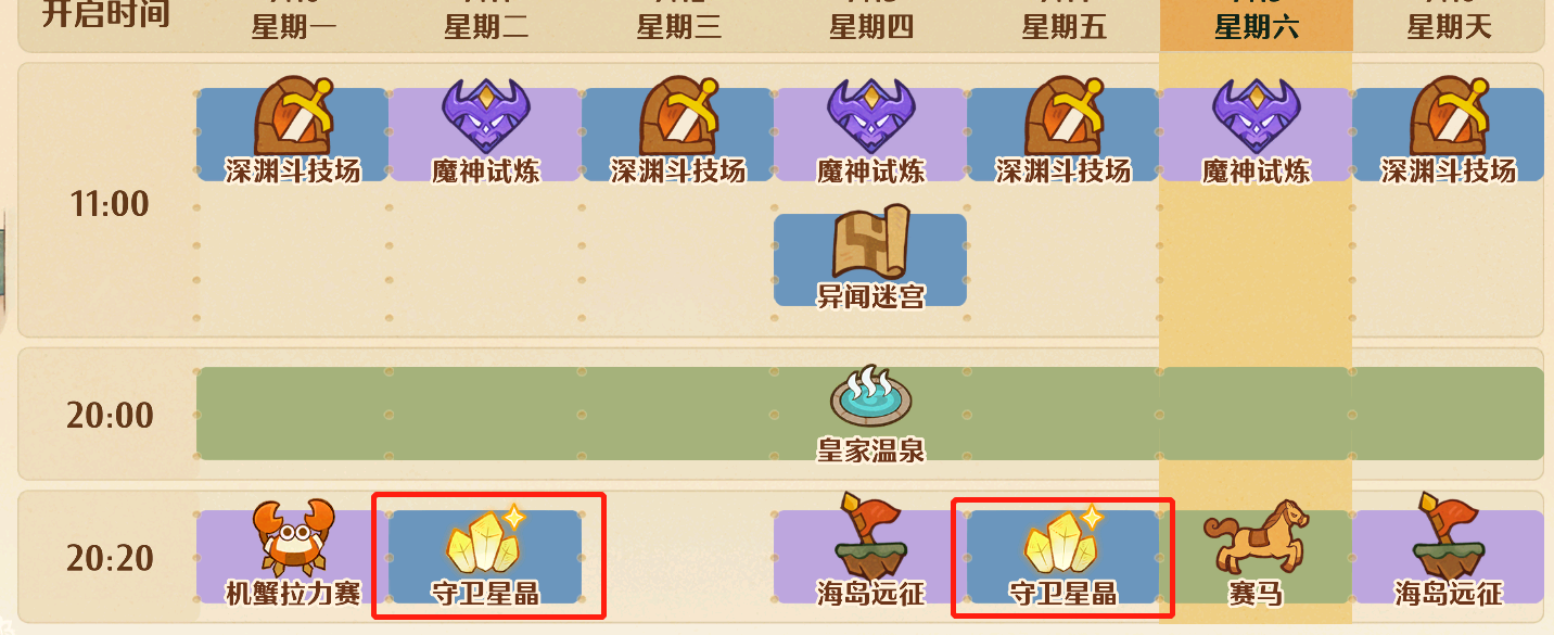 首先想玩好守卫星晶,你就得了解清楚它的相关设定,第一个就是它的开放时间,该玩法只会在每周二和周六晚上的八点二十开放,所以其他时间大家就不要浪费时间去苦等了。