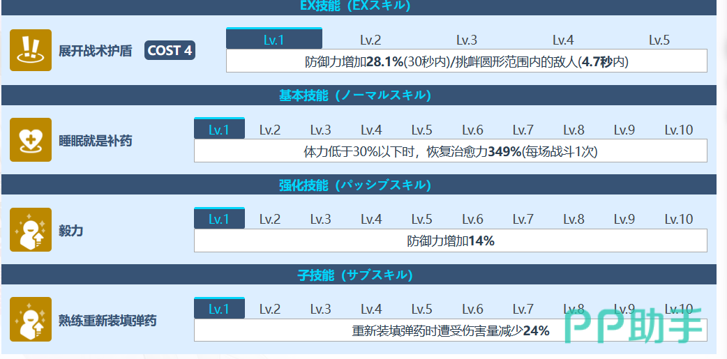 接下来就是强化技能的讲解了。他的强化技能名称为毅力,每次的话可以提升自己的防御值,高达14%(有没有很心动呢)。熟练的重新填装弹药的技能,就是在春使用冲锋枪时装填弹药可以避免一定的伤害,可降低42%左右。但是这个技能需要该角色达到三星的时候,才能够解锁哦。
