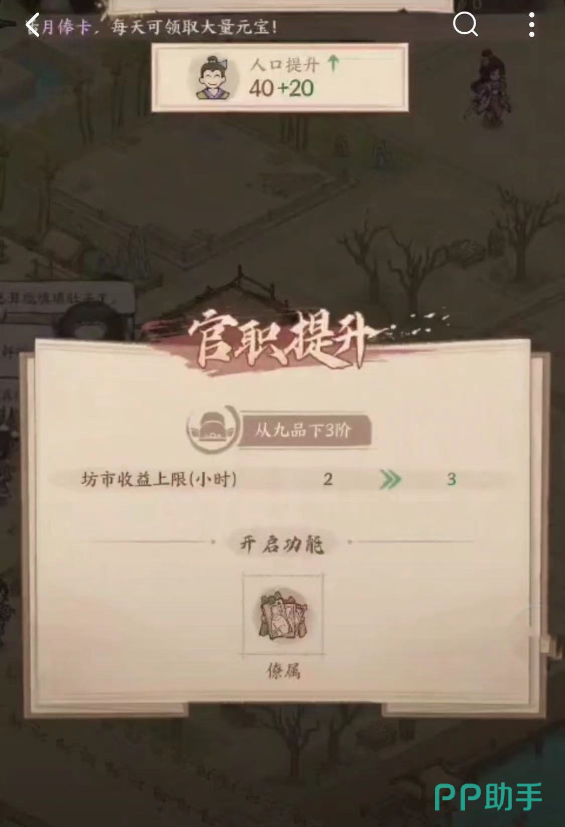 以上就是这城有良田怎么提升官职的内容分享了,随着官职的提升游戏中开放的内容也就会越多,但是这一切围绕的核心依然是城市的人口。所以说这个游戏还是个很不错的养成类游戏,对这类游戏感兴趣的玩家们可以玩一下。