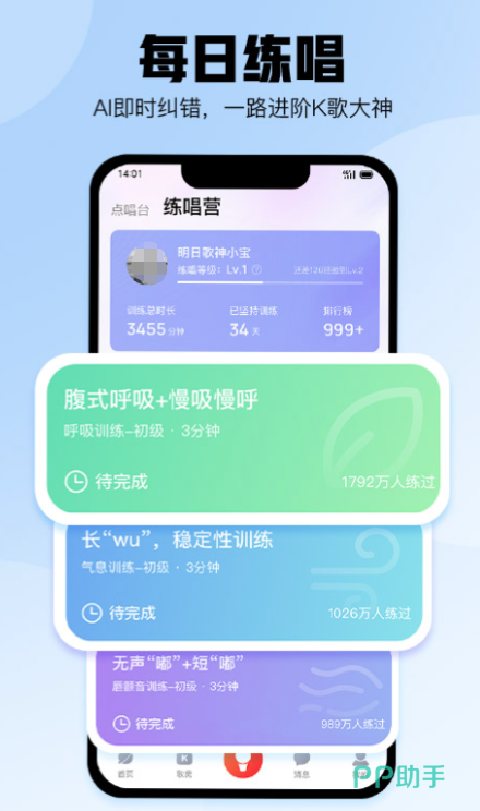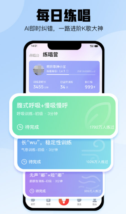 是否因为自己唱歌时老是跑调或者觉得自己的音色不够好而导致自己不敢开口唱歌呢?下载酷狗唱唱来练习唱歌吧,酷狗唱唱这款软件不仅为喜欢歌唱的广大群体们提供了一个方便的唱歌环境,还让大家能在里面练习歌唱。其中包括歌唱技巧中的呼吸训练:腹式呼吸和慢吸慢呼以及歌唱技巧中的气息训练等各种歌唱技巧让喜欢歌唱的大家能在该软件中每天进行练习。