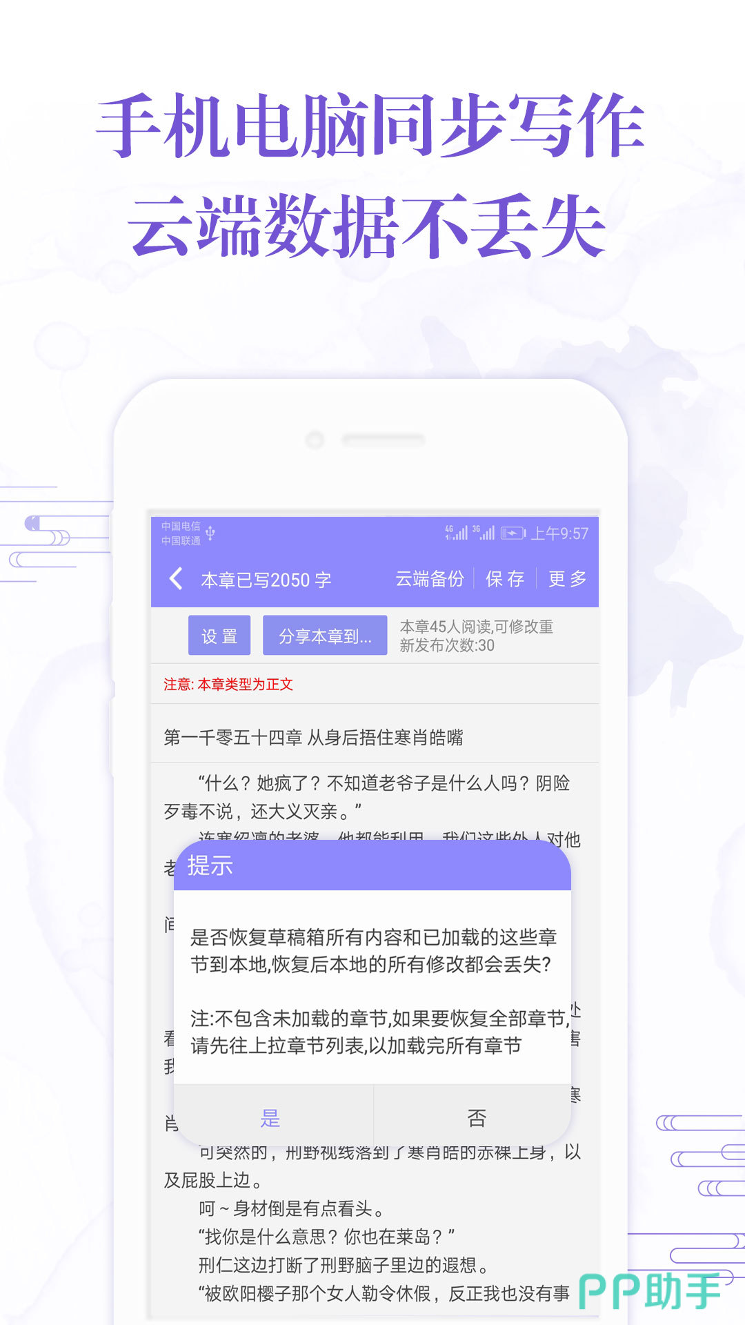这款写小说的工具能够帮助大家提升写小说的效率,并且尽情稿子的云保存,还可以写小说,写大纲,随时记录灵感,甚至还可以进行效率的统计,小说字数的分析,也可以将这些作品分享出去。