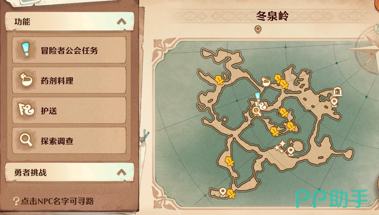 打开大地图找到冬泉岭之后不难发现它上面已经标注好了许多图标,其中比较值得留意的是黄色的剑刃图标和拱门图标,剑刃图标代表的是可以挑战的NPC,通过挑战他们你可以吸收更多的战斗经验,同时如果战胜了他们那么还可以获取各种意想不到的奖励。