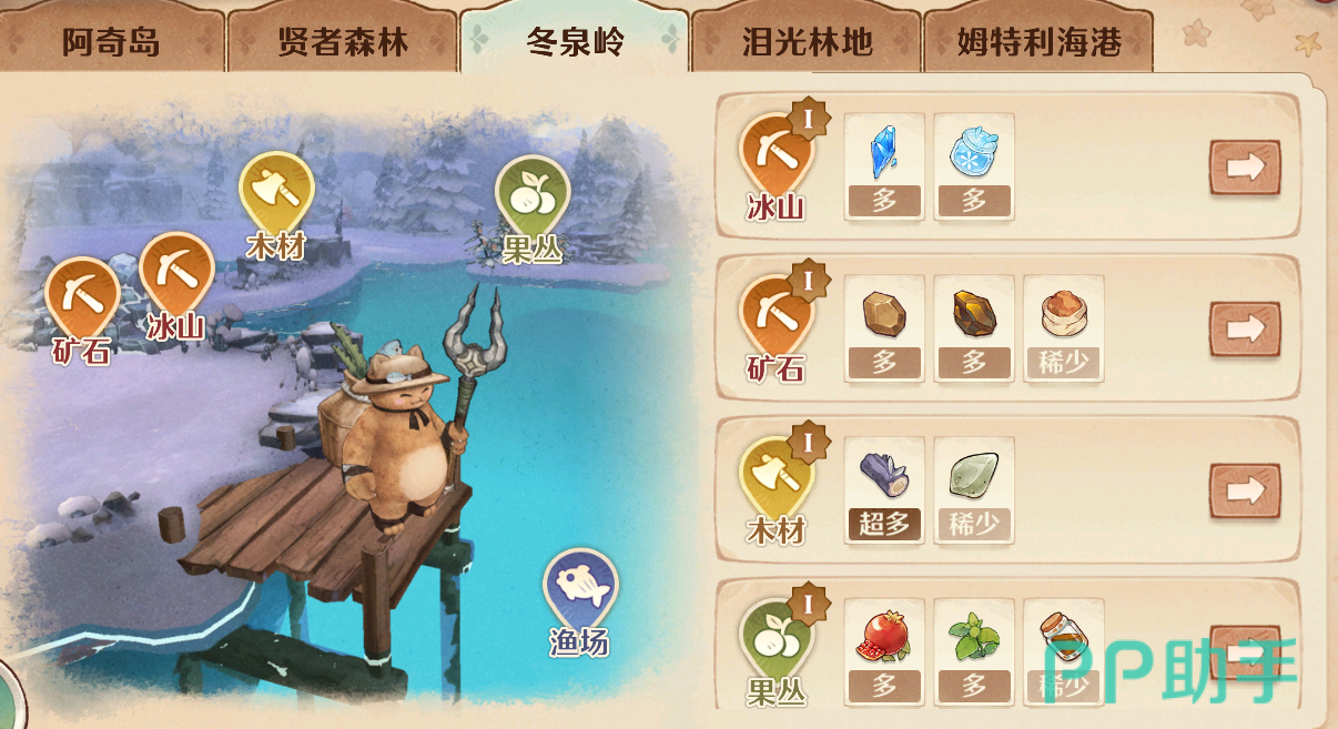 最后如果你已经解锁了自己的生活职业,那么还可以前往冬泉岭采集各种各样的生产原料,这些原料包括冰山上的“冰块”和“水”,渔场中的“鳕鱼”和紫菜等等,所以总结来说,冬泉岭是一个资源极为丰富的地方。