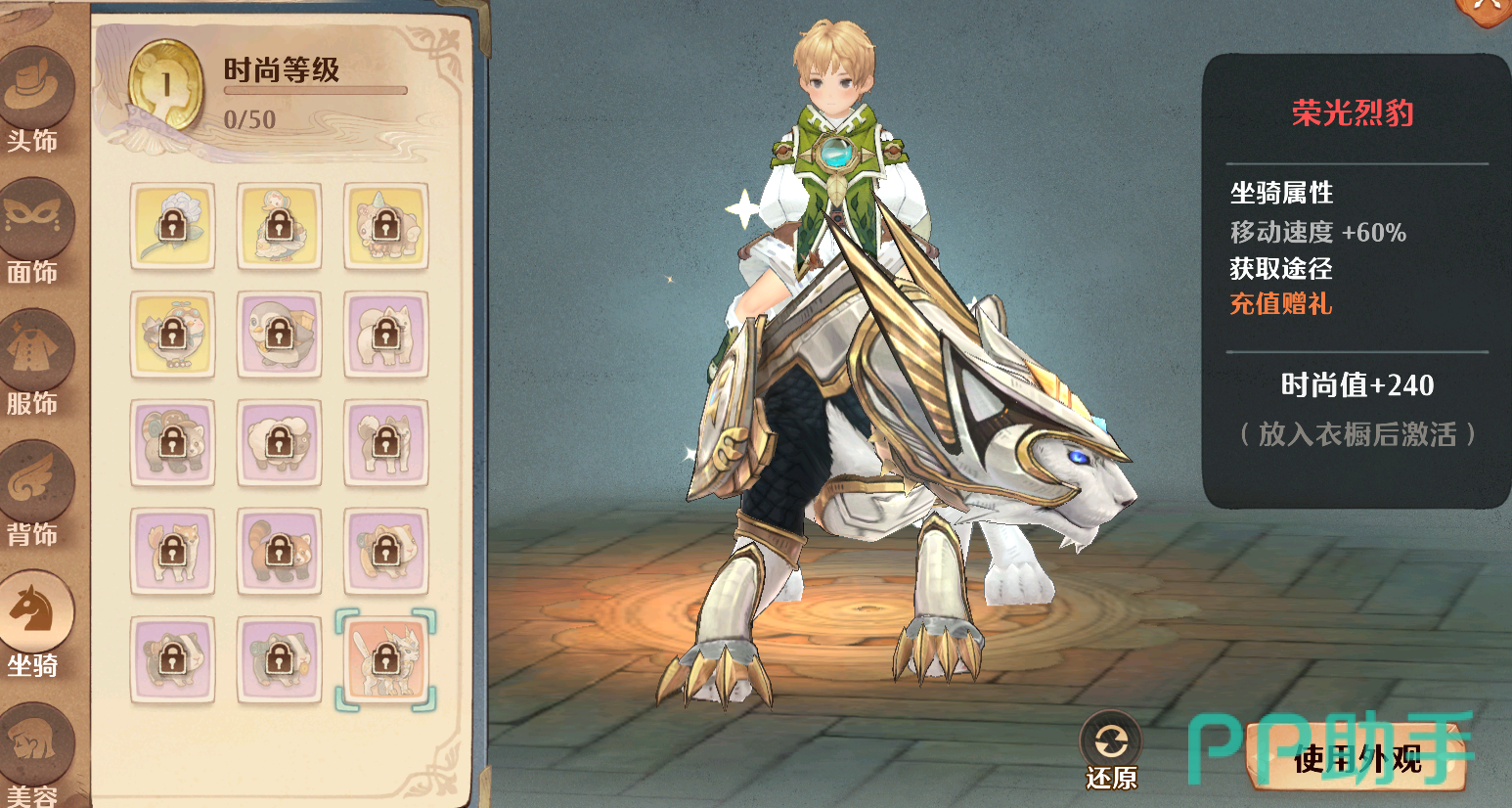 另外还有其他许多紫色的坐骑是通过主线剧情,任务以及限时活动产出的,这些相对来说门槛会稍微低一些,还有橙色品质的那些坐骑则大多需要玩家在家园的织坊中进行制作,它们对比红色的荣光猎豹只少了20%的移速加成,而且增加的时尚值也都是过百的。