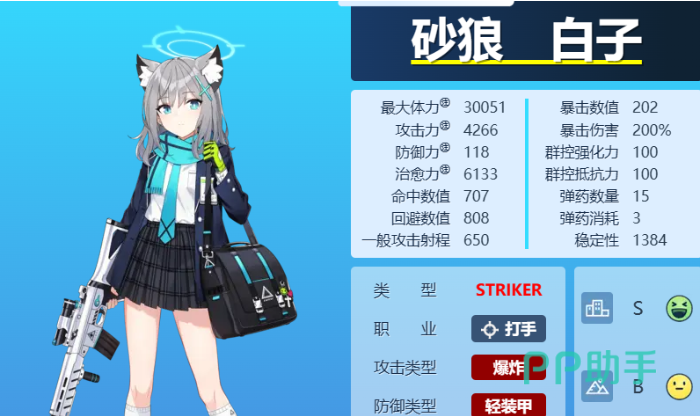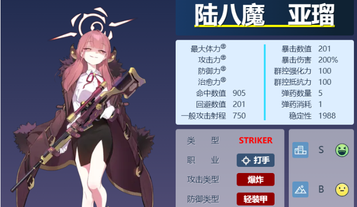 亚瑠的职业是一名打手,也就是说除了以上提到的,亚瑠在作战方面也是有着不俗的实力的,妥妥的输出,拥有爆炸的攻击类型,轻甲装是她的防御,优势很明显就是在于打出暴击型的伤害了,暴击伤害达到200%,攻击力方面可以说是妥妥的S级别。