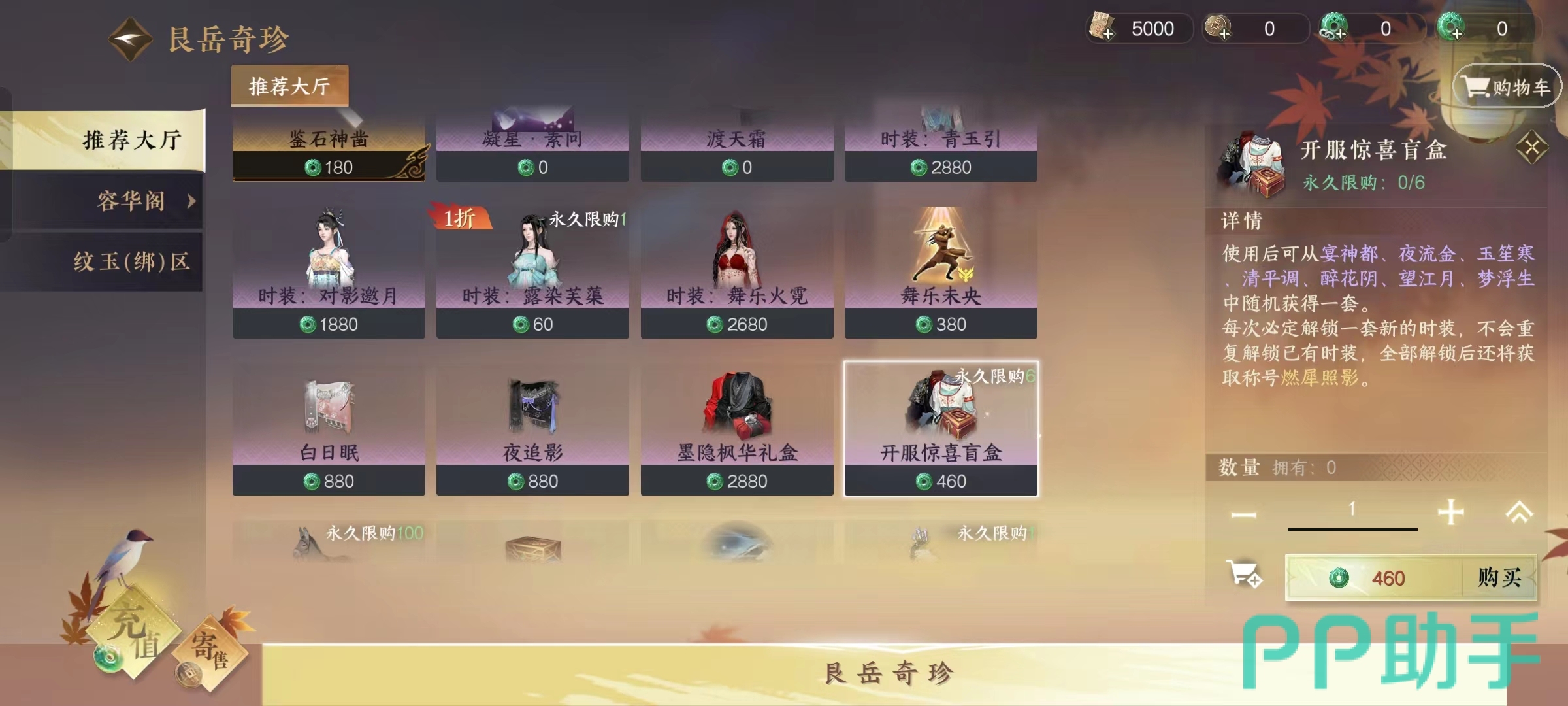 盲盒中的六套衣服品质都不错,基本达到了紫色的水平。时装风格百变,才会受到所有玩家都喜欢,毕竟玩家的穿衣风格都不一样。在【艮岳奇珍】的【推荐大厅】里购买,该盲盒的购买不需要玩家达到什么样的水平,只需要通过新手阶段就可以看到时装盲盒,永久获得该盲盒。