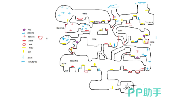 第二张是更加复杂的地图,和上面的差别是多了很多的矿石点。右上方的有紫水晶和猫眼矿石,左下方有钻石和镐石,玩家们如果需要这些矿石,可以去这些地点进行搜索。