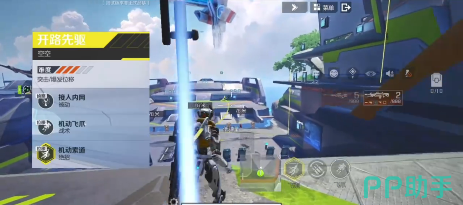 空空一共有三个技能,分别是烟雾弹,火箭弹和滑翔索。玩家在使用滑索时,空空可以在空中进行一段时间内的自由飞行,无论是在进行突进还是逃跑时,都非常实用的一个技能,能动性非常高。玩家可以向目标位置进行烟雾弹的释放,对被命中的敌人产生爆炸的效果,但也会对本身产生一定的反作用力。空空使用烟幕弹技能之后,迷惑敌人的视野,在进行逃跑和撤退时起到一定的掩护作用。
