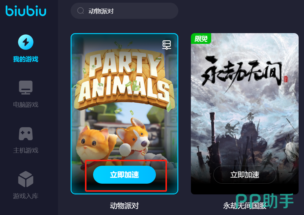 下好biubiu后,你只需要搜索“动物派对”然后将其添加到自己的专区,之后点击“立即加速”即可享受到它的加速效果。需要注意的是该游戏本身属于国际服游戏,因此加速自然不可能免费,不过biubiu有着良心的首充折扣,你只需花费少量的成本即可体验电竞级的流畅加速效果。