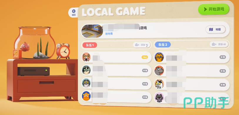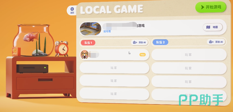 先来到游戏的主页,然后选择在线或者本地游戏,之后即可看见下图的这个界面弹出,它这个就是创建房间的界面了,在创建过程中你需要设置房间的地图以及模式,如果是和朋友一起玩的话建议选择抢夺赛,因为这个模式有着队伍的设定,会在一定程度上需要两人配合游玩。
