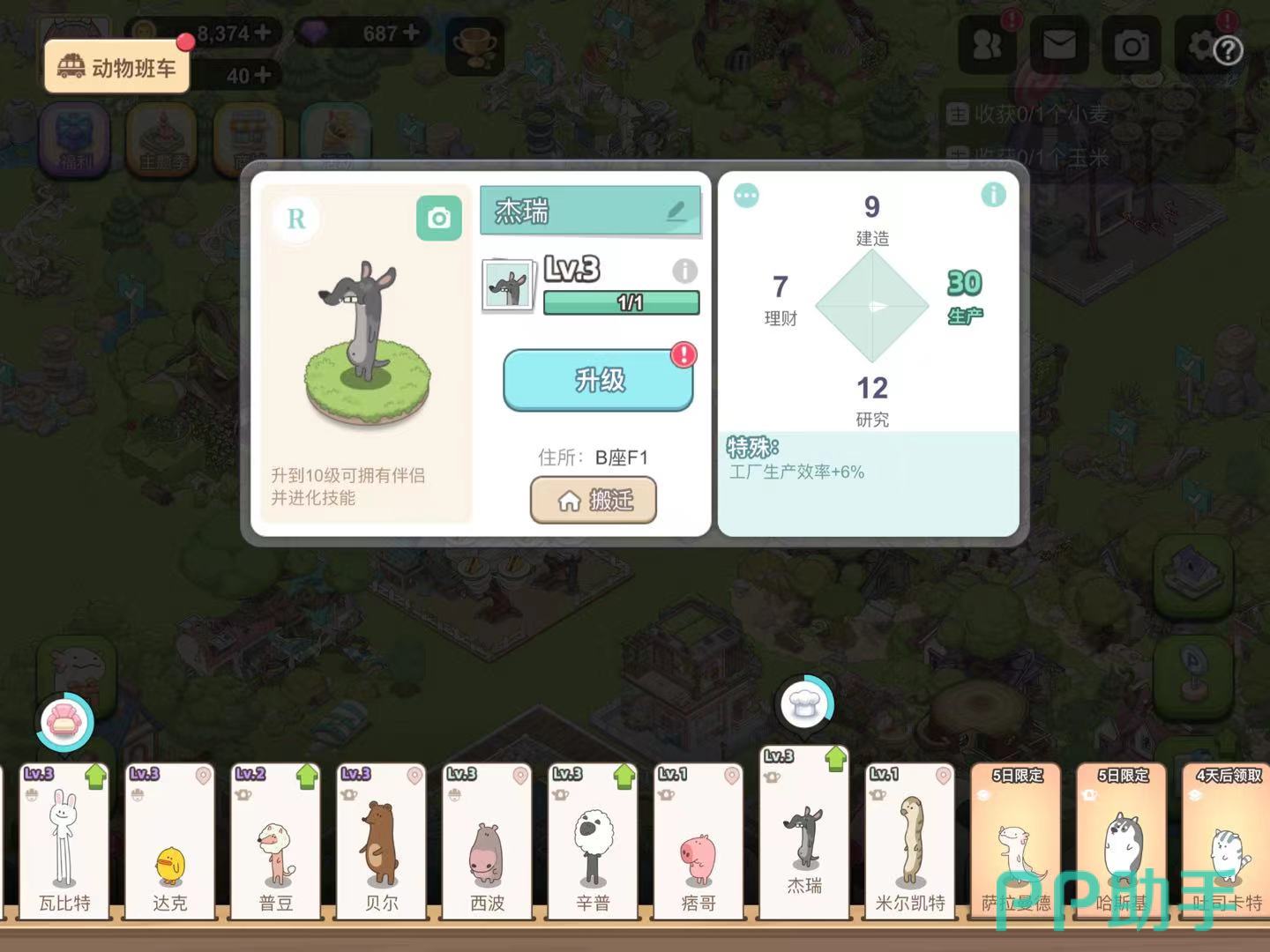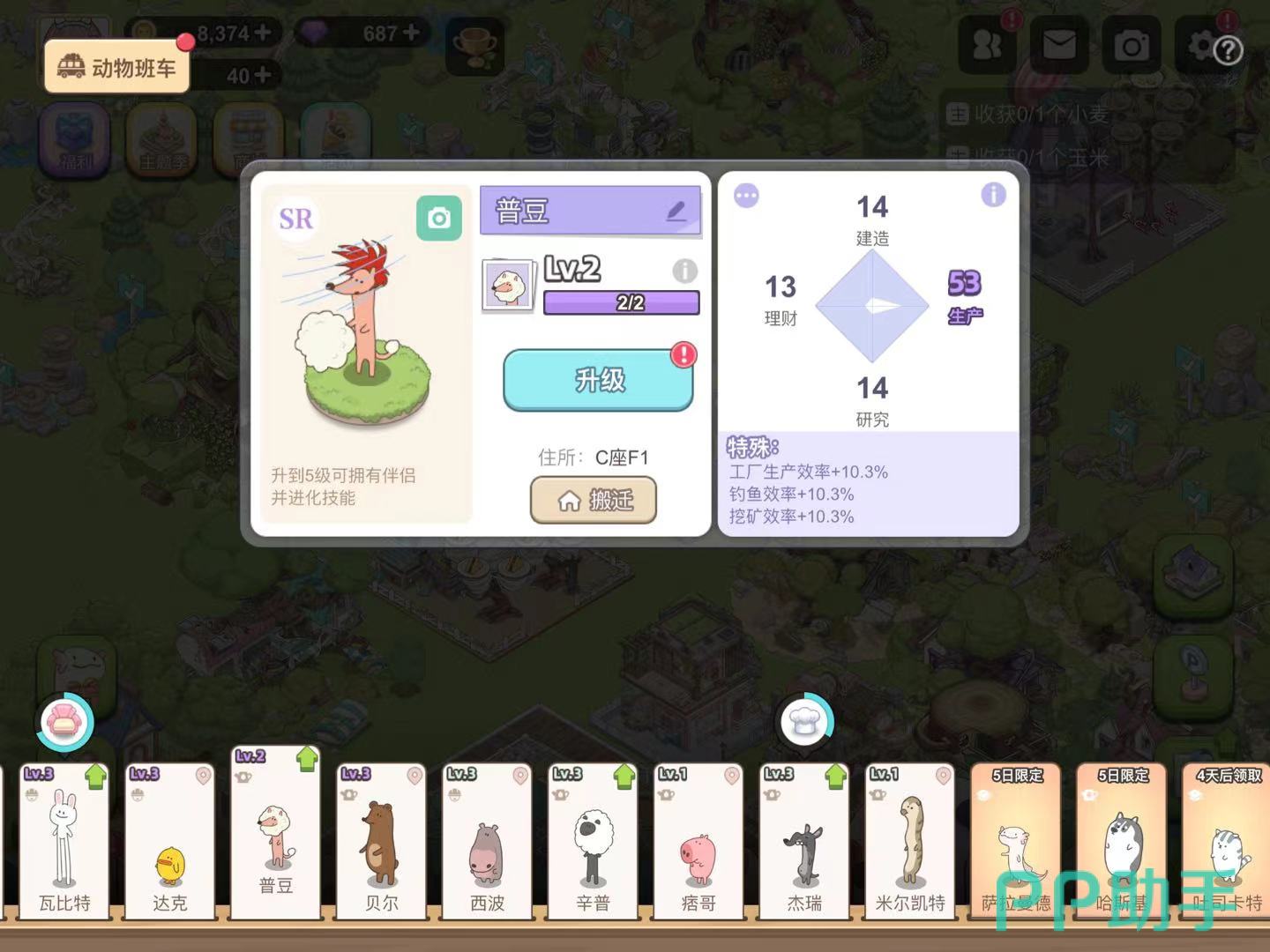 而且不同稀有度的动物局面所能提升的工厂效率也大有不同,例如R卡杰瑞仅能产生工厂效率增加6%的效果,可SR卡动物居民普豆却能让生产效率提升至10.3%,差不多是杰瑞的两倍,这也意味着玩家在挑选入驻工厂的动物居民时,大可以根据稀有度来作为选择标准。