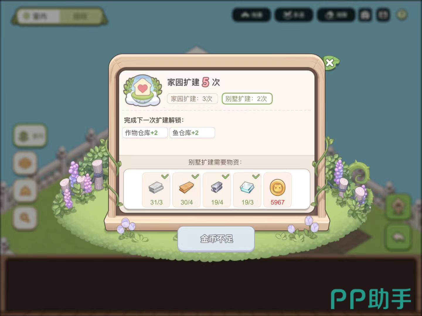 而家园扩建影响的是鱼类仓库和农作物仓库。要知道,这两种仓库与工厂仓库一样也互相独立,但在提高上限方面却都受到家园扩建。无论玩家扩建的是别墅还是庭院,每扩建一次都有机会让两者的仓库上限获得一定提高,不过也有可能仅提高其中一种。