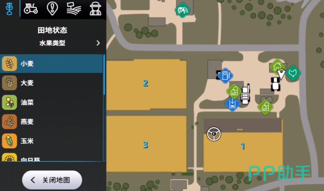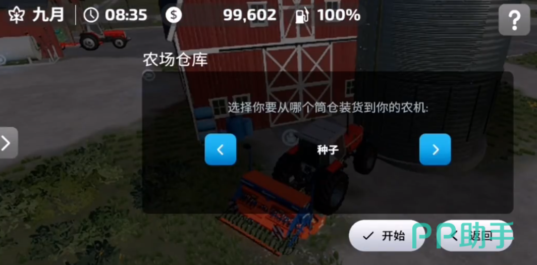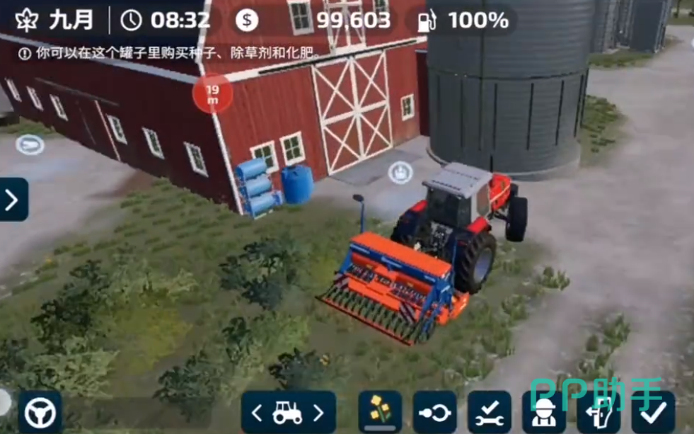 首先玩家要来到自家宿舍背后的农舍,点击定位,开播种机到目的地,将车移到农舍的停车光标,可以购买到种子、除草剂与化肥,点击种子选择购买,就能自动将种子装载到播种机上,接着找到一个开垦完的农田就能播种。