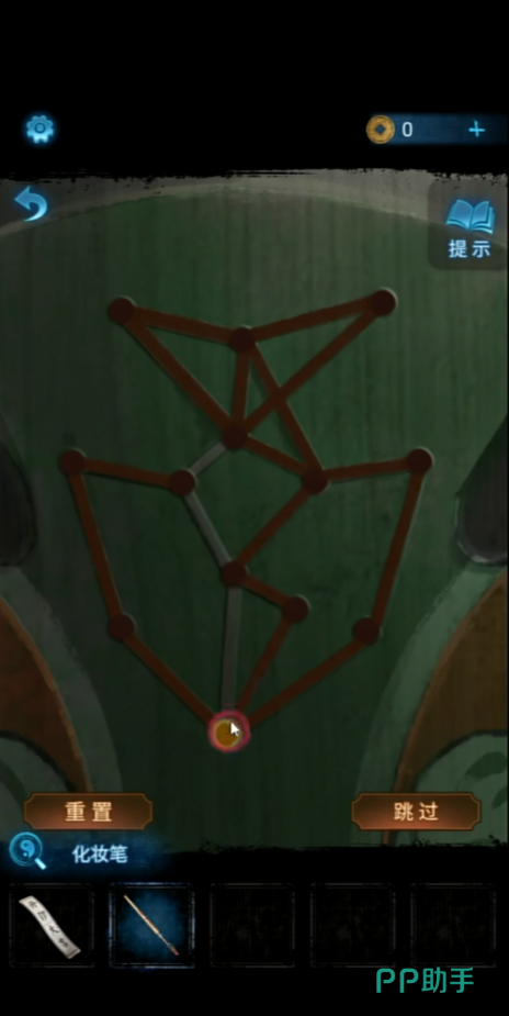 点击桌子查看书籍获得信息和一张开锣大喜封条,使用纸伞将门上的电闸推上去,电闸打开之后返回外面舞台上,舞台的电子屏上显示了【囍凶娶丧奠吉嫁婚】这几个字。然后点击台下左边的座椅,拿到一个木盒,根据电子屏上的字,将木块放入正确的位置,木块顺序为【囍奠丧婚吉嫁】,打开木盒子就可以拿到一支化妆笔,然后返回到暗门里使用化妆笔蘸取桌上的油彩,然后点击绿色门,按照陶怼怼给出的提示寻找奇数点将红点全部连接(这里是可以重复的,难度还是比较简单的)。
