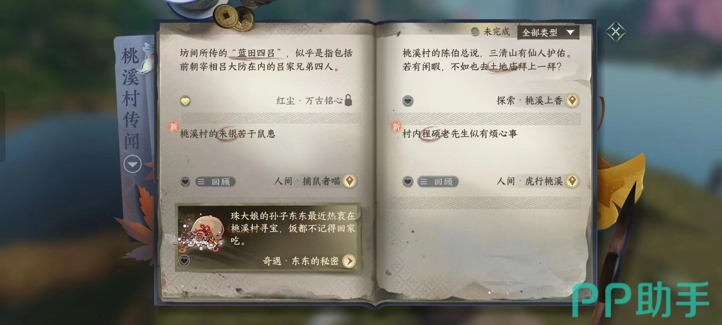 传闻看起来就是一本书,在这本书里包含所有的任务,在【全部类型】中看见,例如奇遇、探索、人间任务、红尘等,今天小编分享的是逆水寒手游桃溪村传闻攻略,任务很多,小编就介绍自己完成的几个传闻任务,并且同步写完攻略了,看下面的内容就知道是哪几个桃溪村传闻介绍了。