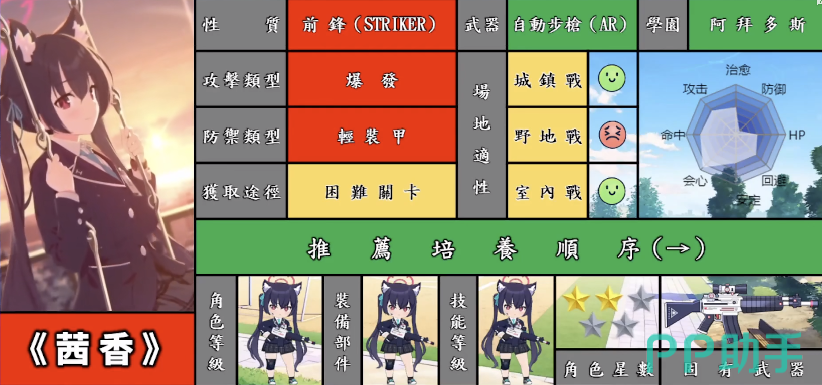 基本技能则是对一名敌人造成伤害,伤害值取决于面板。强化技能则是攻击力强化,强化倍率非常不错,再配上专属武器,可以让茜香打出非常高的伤害。子技能则是提高茜香攻击速度的,这个没什么好说的,还是加dps的。从以上技能来看,就能看出茜香拥有着非常强大的爆发力,可以在短时间内对单体敌人造成大量伤害,非常适合做前排输出角色使用。