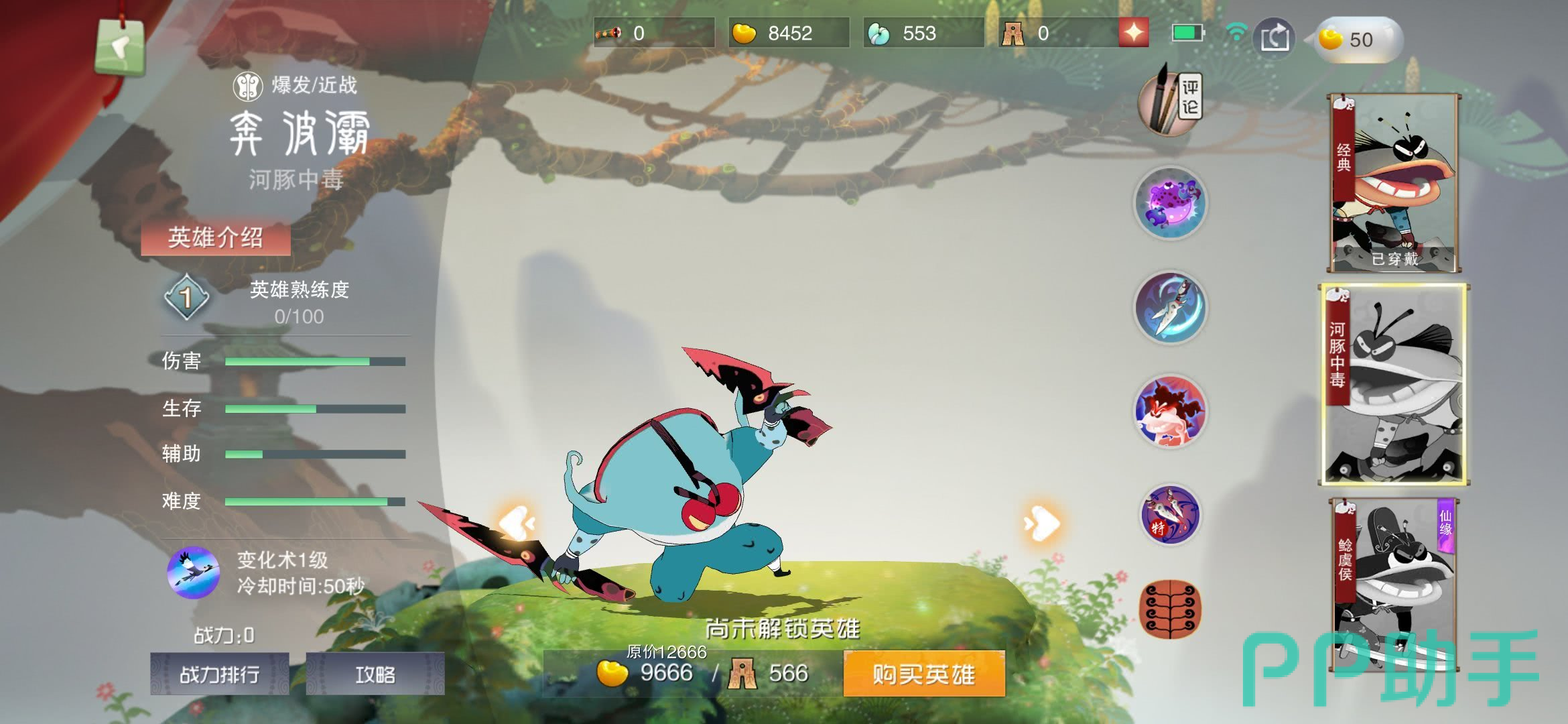 这个角色的主要攻击方式是近战输出,其技能会给敌人造成持续性流血伤害,奔波霸的的普通攻击技会让敌人触发流血效果,而且还会叠加5层,在叠满之后伤害极其可观,一技能开启后会抛出河豚炸弹,会让命中的敌人触发中毒效果并且在回合中持续掉血,二技能是主要一个位移伤害技能,开启后奔波霸会快速位移到敌人附近,对碰触过的敌人造成伤害并造成放血效果,而且会使敌人的流血效果增到2.25倍。