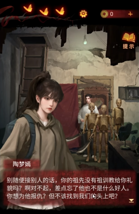 陶梦嫣——因为超强的毒舌能力和在第二部的怼人场面中,被玩家们亲切的称为陶怼怼,在纸嫁衣系列中,目前她是唯一的一个两部都是女主身份,新作的整体剧情可以看做是她前世因的今世果。