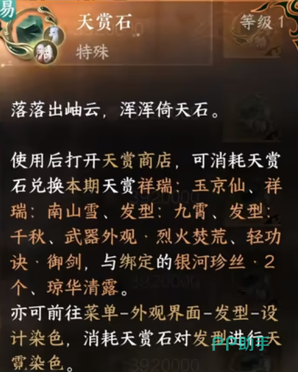 天赏石是特殊的金色道具,使用可以打开天赏商店,消费该石头兑换本期天赏的物品。比如7月份的天赏大奖是:祥瑞白鹿=、烈火焚荒武器外观、白发、绑定银河珍丝等,而且天赏石还能对稀有发型进行天霓染色。获取天赏石方式主要有两种,一种是直接在交易所市场摊位使用铜钱购买,另一种则是用氪金抽奖的方式抽神石鉴华池。