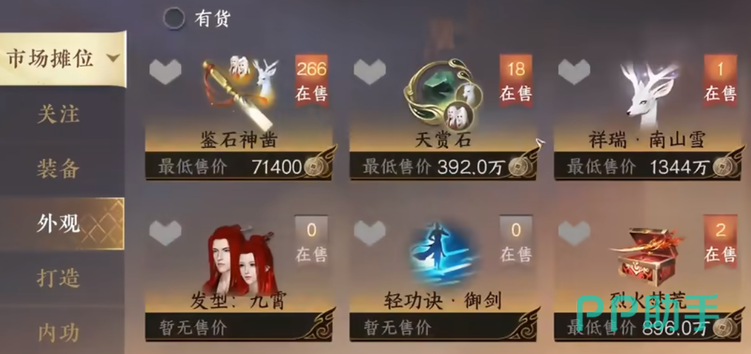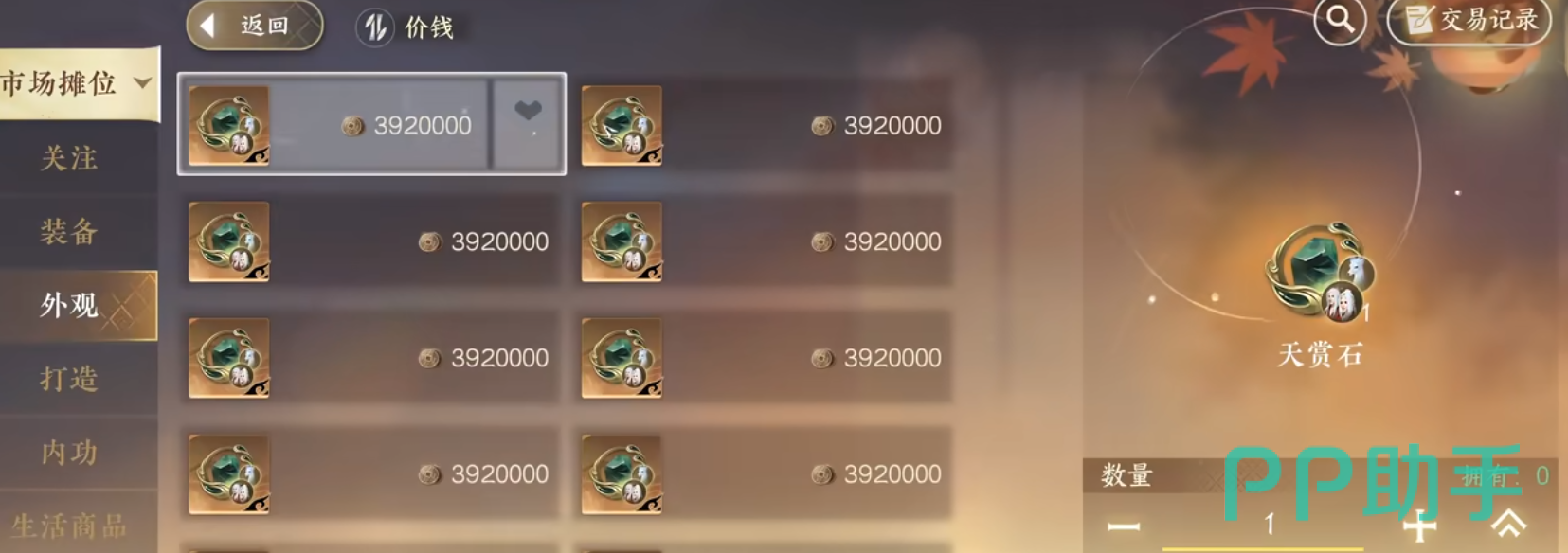 首先点击交易所-市场摊位-外观,即可以看到在线销售的天赏石,目前天赏石售价为392万,但是随着数量增减有价格波动。抽神石鉴华池则比较看运气,需要满180枚氪金纹玉购买鉴石神凿抽一次,天赏保底在3240元左右。