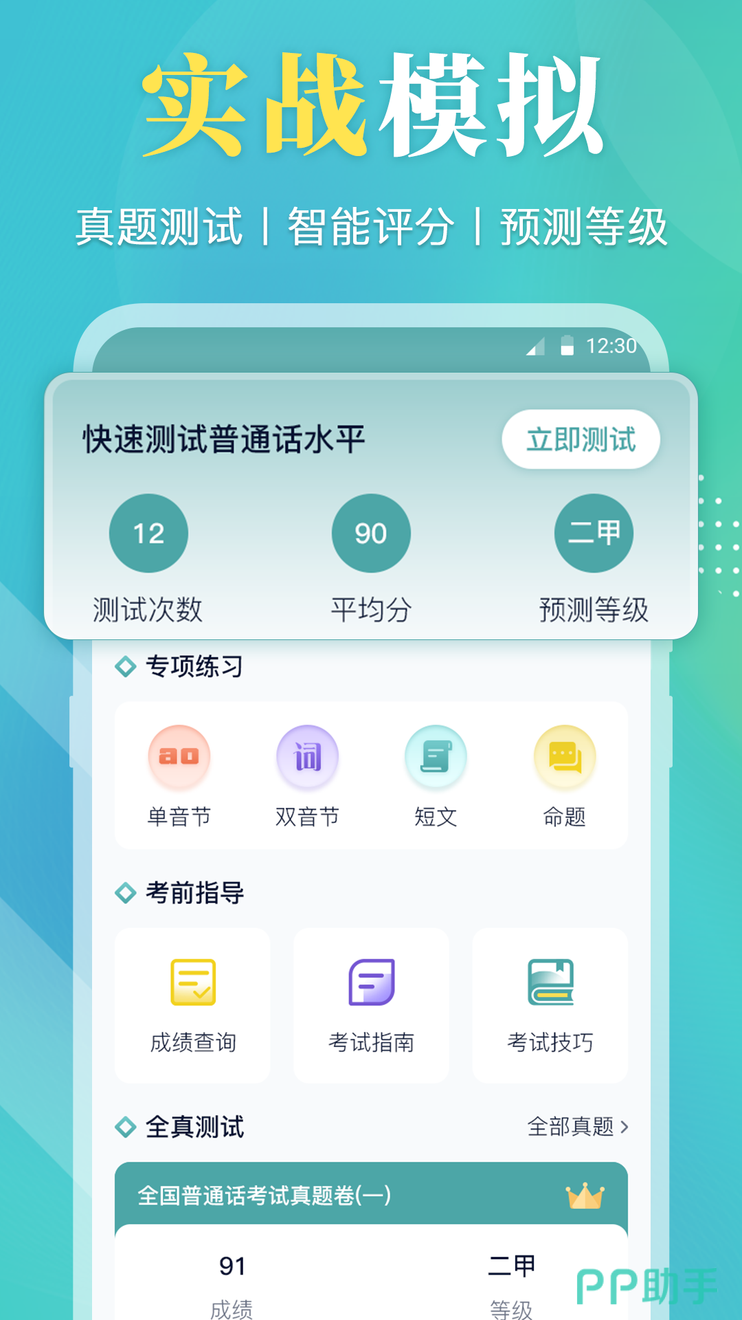 再这款专业的普通话水平测试工具里面用户可所有和声音以及普通话密切相关的专业学习课程,帮助大家纠正英语。汉语口语的发音,并且在线进行智能化的语音测试,了解自己的普通话水平。进入到模拟的真实考场当中,进行有针对性的检测,还能够根据生声母韵母,声调以及各种字节的读音来进行有针对性的管理。