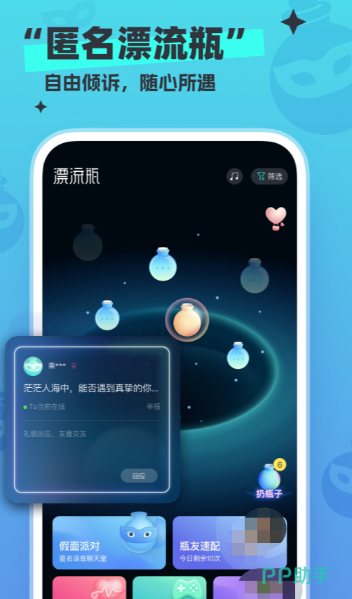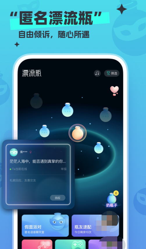 还记得以前的邮箱漂流瓶吗?现在有新的漂流瓶了,每天可以将自己的心情或者不开心的事写进漂流瓶里,扔进大海,就会有捡到你的漂流瓶并对你回信,也许你还会在这里相遇到你的另一半,通过做任务可以来提升你们之间的感情,不尴尬,不无趣。