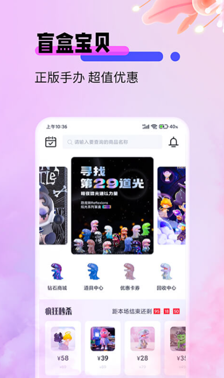 盲盒宝贝APP是一款集齐了大量人气潮流手办盲盒的软件。可以进行在线开盒随时随地都能享受到拆取盲盒的乐趣,完美还原线下抽盲盒的场景。官方直购的正版手办盲盒,质量得到保障。拥有限时秒杀的福利,秒杀盲盒每日都会更新。如果抽取到不喜欢的盲盒,可以进行一键回收。