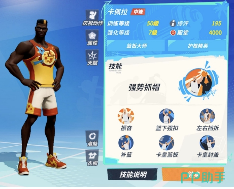 卡佩拉在游戏无论是得分能力以及各种防守能力都是一流的,合理运用好它的潜能可以打出不一样的效果。他的技能主要是集中在内线区域当中的,主要方面就是进攻以及扣篮,同时在防守能力上他做的也是十分不错的,比如最基本的抓帽以及左右格挡和封盖等等都非常不错。