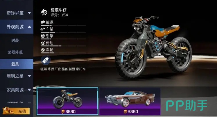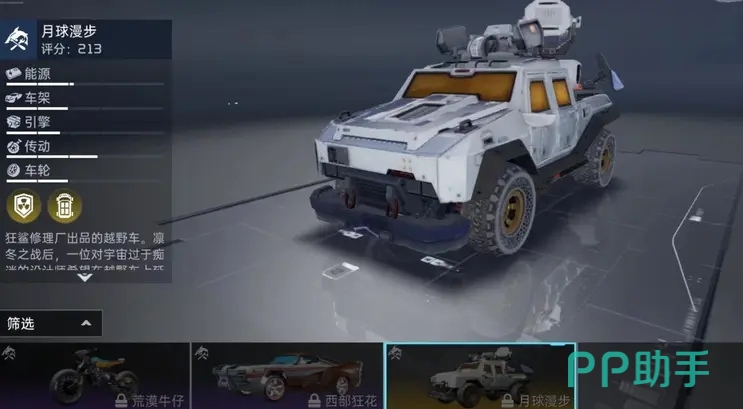 最后,为玩家介绍的是狂杀修理厂,主要拥有月球漫步,西部狂花和荒漠牛仔。西部狂花属于轿车类型,采用较为复古设计,月球漫步为越野车,适合野外行动,荒野牛仔属于越野摩托车,比较轻便灵活。月球漫步,拥有两个独特的技能,呼朋引伴和极境临压,同时他也是四人载具,他还拥有免疫感染伤害的能力,可以在很多复杂的地形中进行穿梭。
