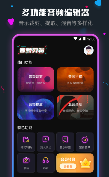 该软件在手机上占用的内存空间比较小,不会使手机出现卡顿,所以大家不用担心,在进行操作的时候非常简单,能够准确的选中所需要删除的部分,将精彩的声音保留下来。通过多种分享途径,将音频分享出去,应用到视频当中,并且还支持变化声音等多项功能,深受大众认可。