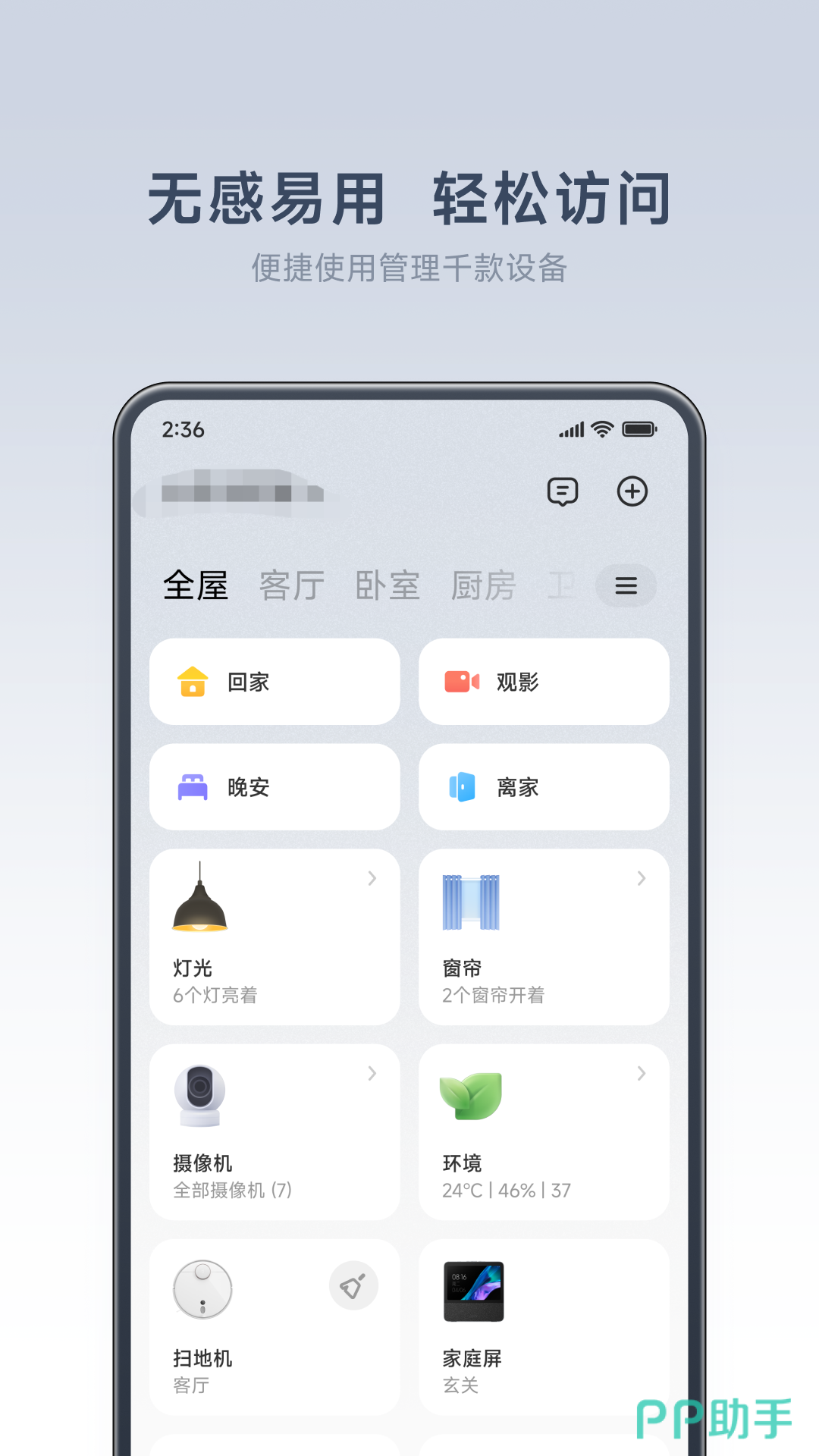 无感易用,轻松访问,用一部小小的手机就可以控制你家里面的家电,与家人朋友一起分享智能设备,设置个性化的智能场景,你和你的家人共同感受科技带来的力量,包括你家的门也可以用这个软件打开。