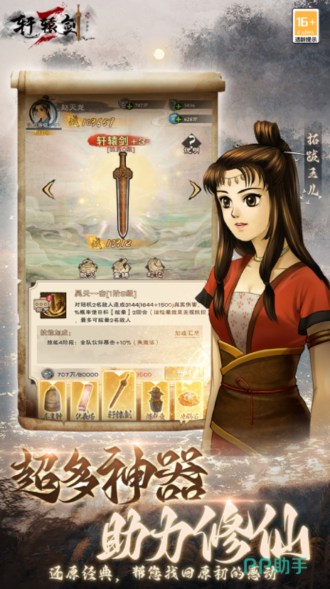 游戏内还有许多英雄专属的神器,比如盘古斧,神农鼎和昆仑镜等神器,它们的外形都完美复制了电视剧里的神器造型,这些神器玩家可以免费获得为自己修仙提供大大的帮助。游戏的画风采用的是国风水彩画风,高度地还原玩家们内心的轩辕世界,在水墨山河之间人物的技能特效也是极美的,给玩家一种独特的视觉享受。