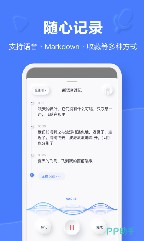 在使用一些手机端的计划软件的时候,大家可能感觉用打字输入比较慢,比较麻烦。那么可以试试讯飞语记这款APP,它是一款让大家实现语音输入的云笔记。可以满足用户对于语音转文字,高清会议的撰写以及图文的编排等。而且对于自己预定的任务,它还有智能提醒功能。帮助您及时完成任务。