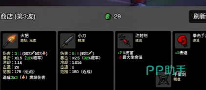小编这一把暴君用的是手里剑,手里剑的适用性非常好,虽然上限不如弹弓高,但是前期手里剑的强度还是比较高的,如果大家前期没有强力的武器也可以使用一些低等级的武器先打工,暴君是不会缺钱的,所以不用担心浪费钱买武器,外星绅士这些增加怪物数量的物品看到了也可以拿一拿,前期多打钱,而且前期怪物血量不多,这些增加怪物数量的基本都是直接给玩家送钱。