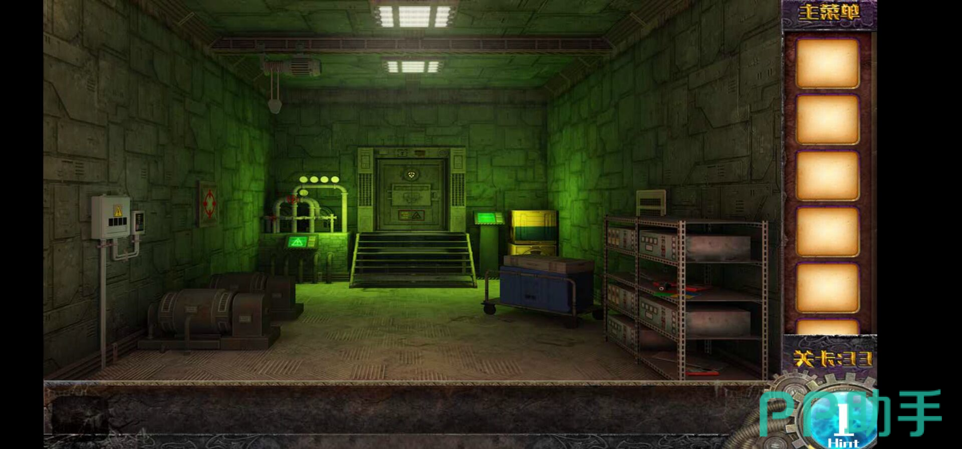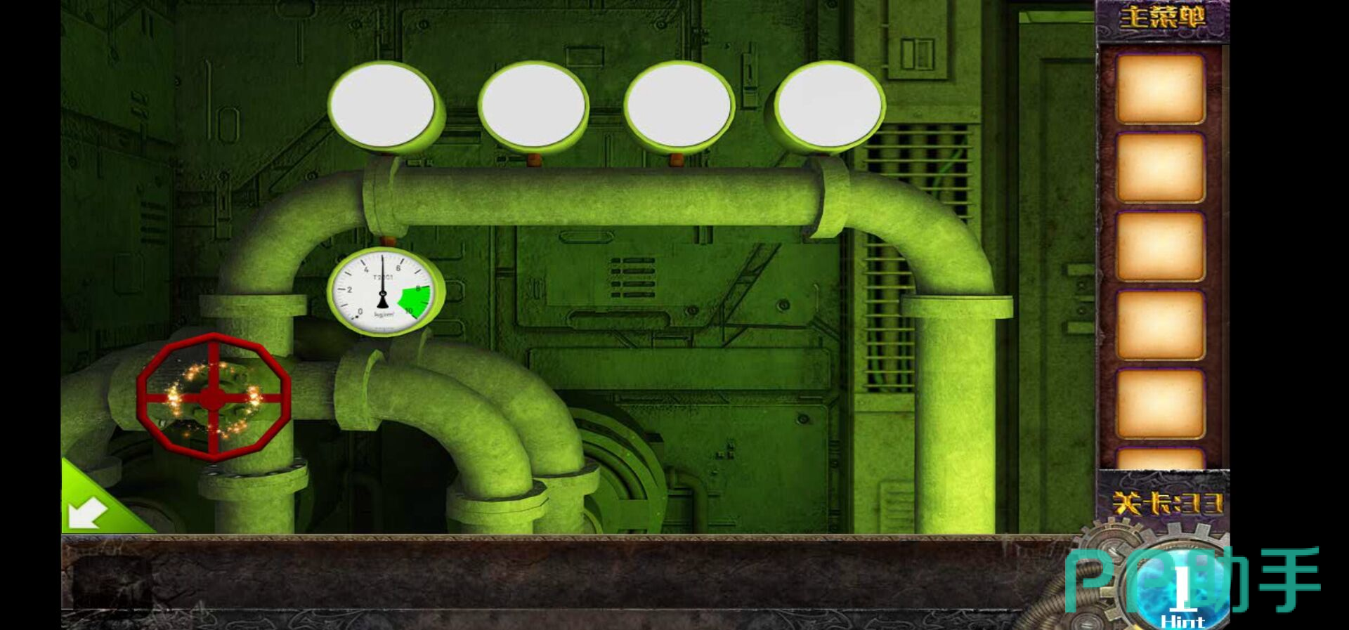 1、第33关是一个机械型房间,房间中都是各种仪器,首先点击门左边有四个白色灯的位置,完成其中的小游戏。小游戏破解方法就是搬动红色的阀门,根据每次亮灯的顺序,在它不亮之后点一遍,需要成功4次才能打开旁边的暗格获得道具。