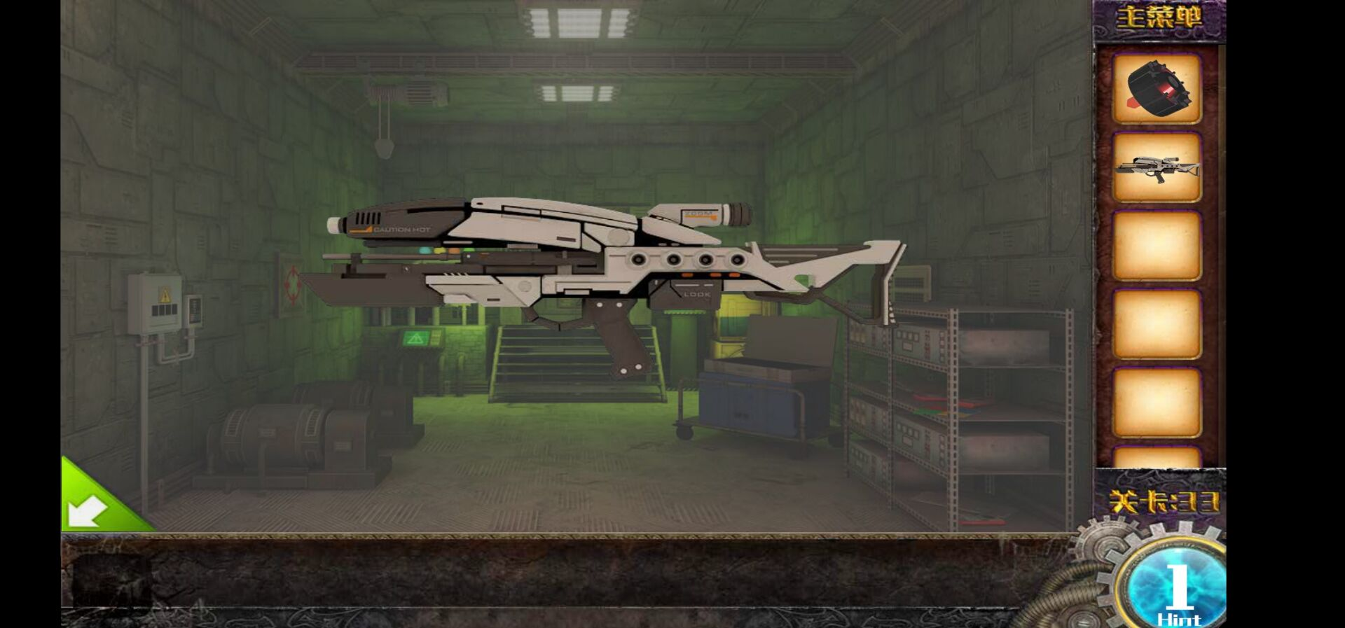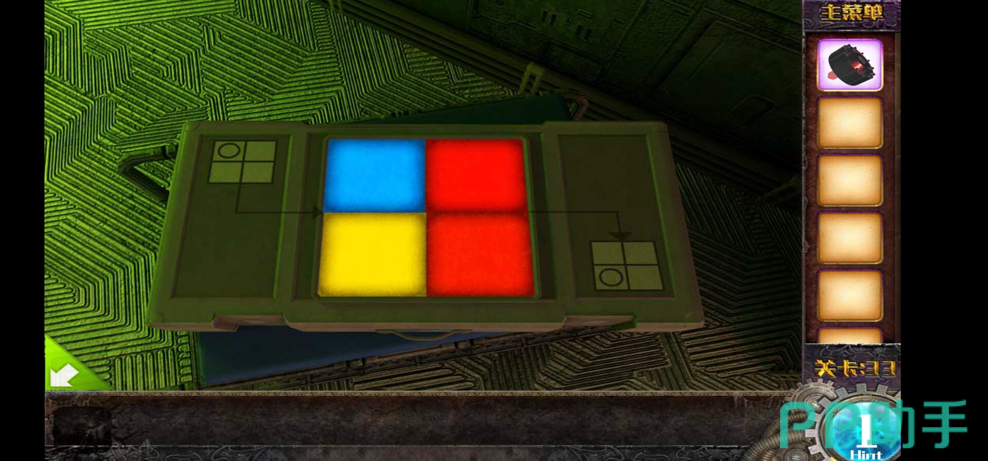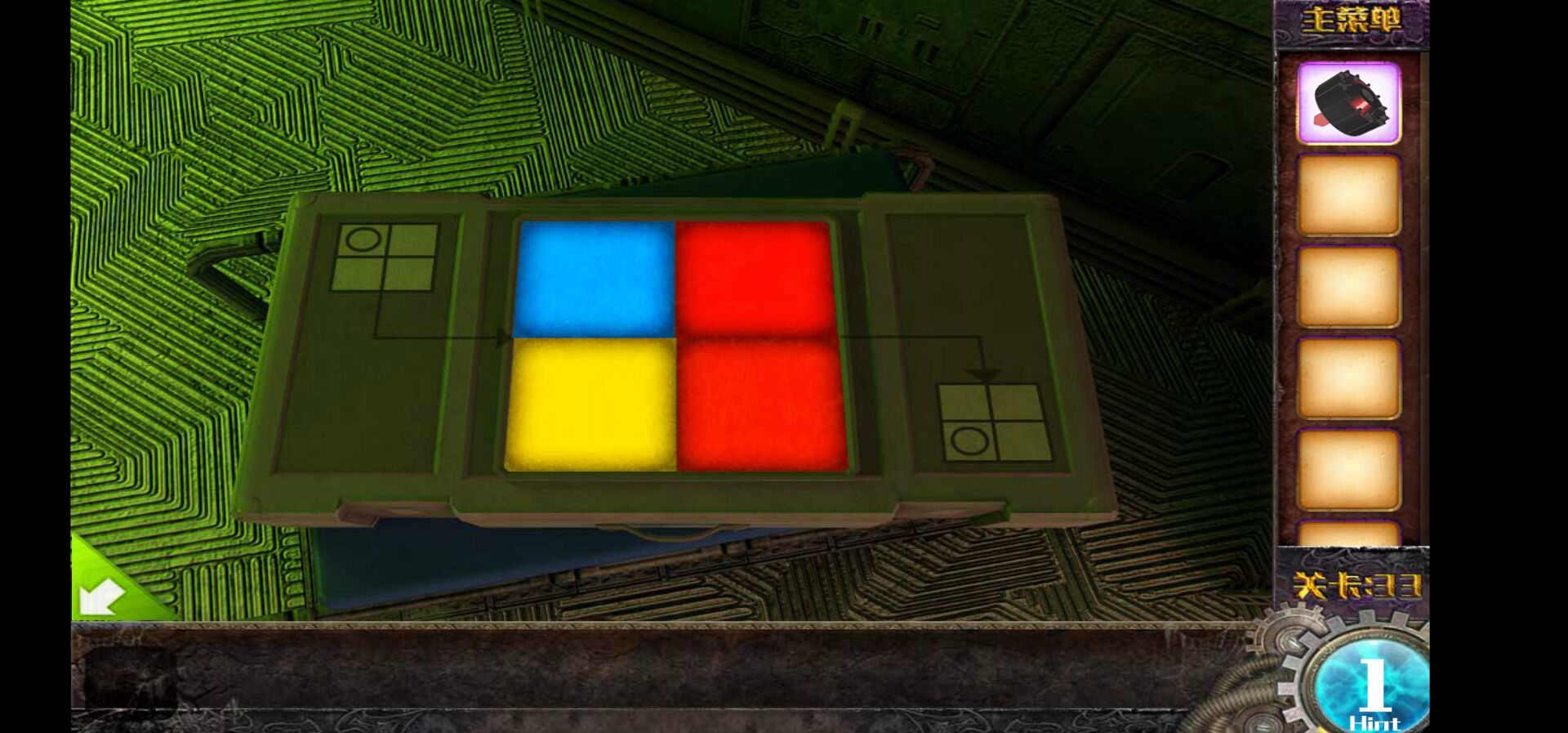 2、点击右边的置物架上可以获得一个道具,道具下面可以看到一个有四色方块提示的图案,打开门右边的绿色屏幕,观察屏幕左上角个右下角的提示,提示的意思是左边两个颜色颠倒,根据四色方块和提示图打开机关获得一把枪。