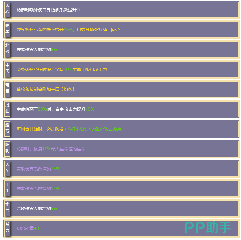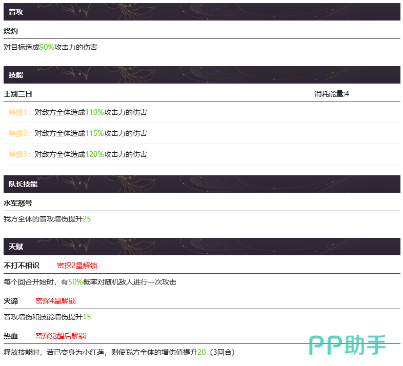 不打不相识可以使他每个回合开始时,有50%概率对随机敌人进行一次攻击。灭谛可以使他的普攻增伤和技能增伤提升15%。热血可以使他释放技能时,若已变身为小红莲,则使我方全体的增伤值提升20%(3回合)。