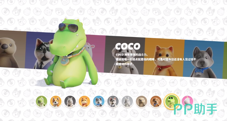 coco:该角色原型是一个鳄鱼,本身体型会比其他角色略大一些,并且它的初始形象也非常的霸气,戴着一副墨镜,并且脖子上还挂着一串金挂饰,看上去非常的具有大哥气质,同时较大的体型也能让你在实战中获得更多的自信,从而坚定自己的每个操作。