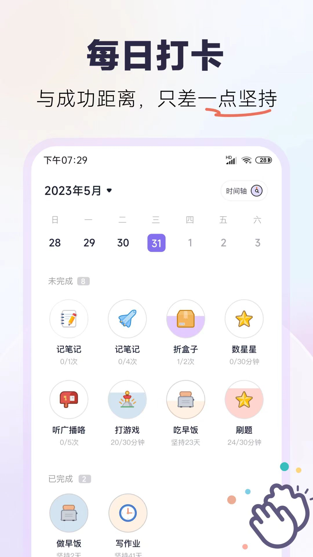 自律养成这个软件可以帮助用户迅速养成好习惯,自定义设置小目标计划,每次完成后点击打卡即可完成任务,打卡界面可详细记录打卡日常,完成设定计划后即可累计心愿币在商城兑换奖励物品,无论是什么身份的人物自律养成的锁定机制都可使用,想要达成的好习惯都可通过这个软件进行培养,培养良好习惯,提升自我修养素质,自律是培养强者的不二选择。好的生活工作习惯可快速帮助我们成长,打败一事无成拒绝摆烂,自律养成从现在开始吧。
